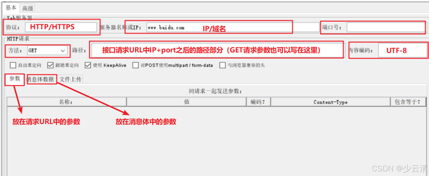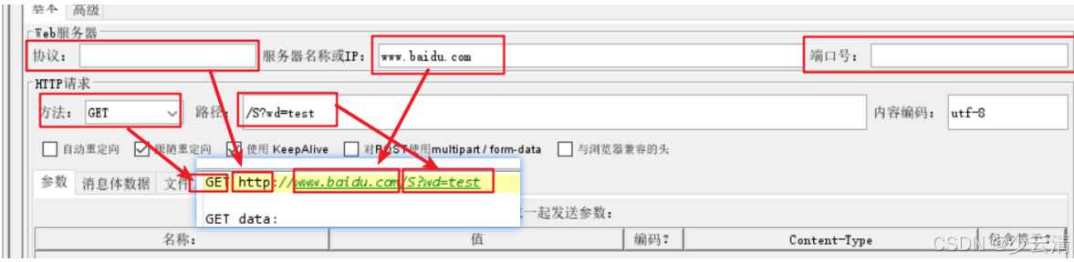 位置: 选中线程组->右键->添加->取样器->HTTP请求 作用: 向服务器发送http及https请求