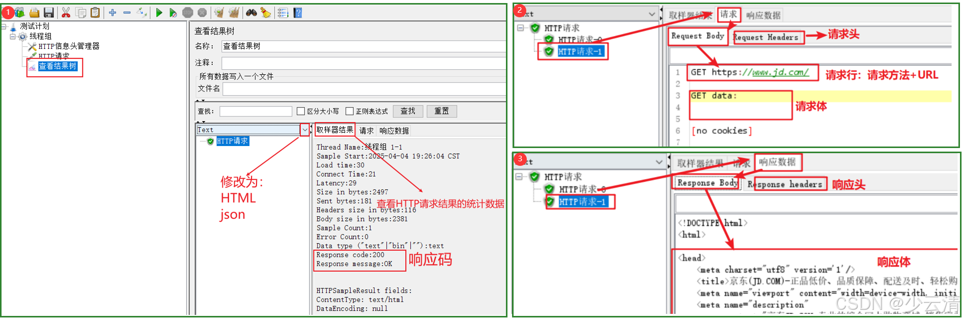 位置: 选中测试计划/线程组->右键->添加->监听器->察看结果树。 作用:查看请求和响应结果。