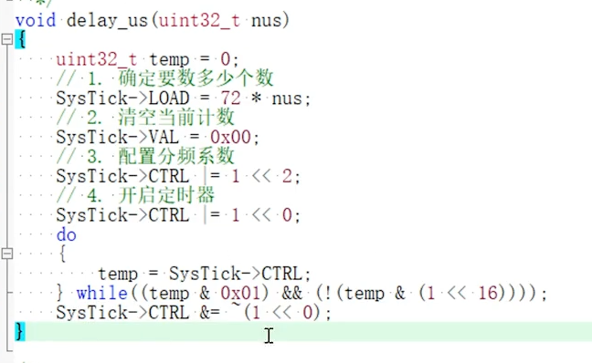 - 该函数利用 STM32 的 SysTick 系统定时器实现精准微秒级延时,核心前提是系统时钟为 72MHz;