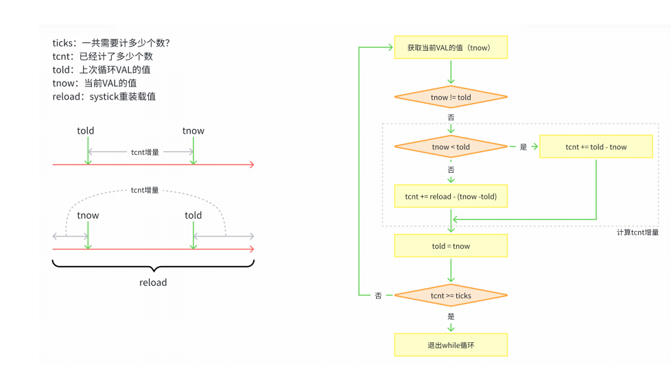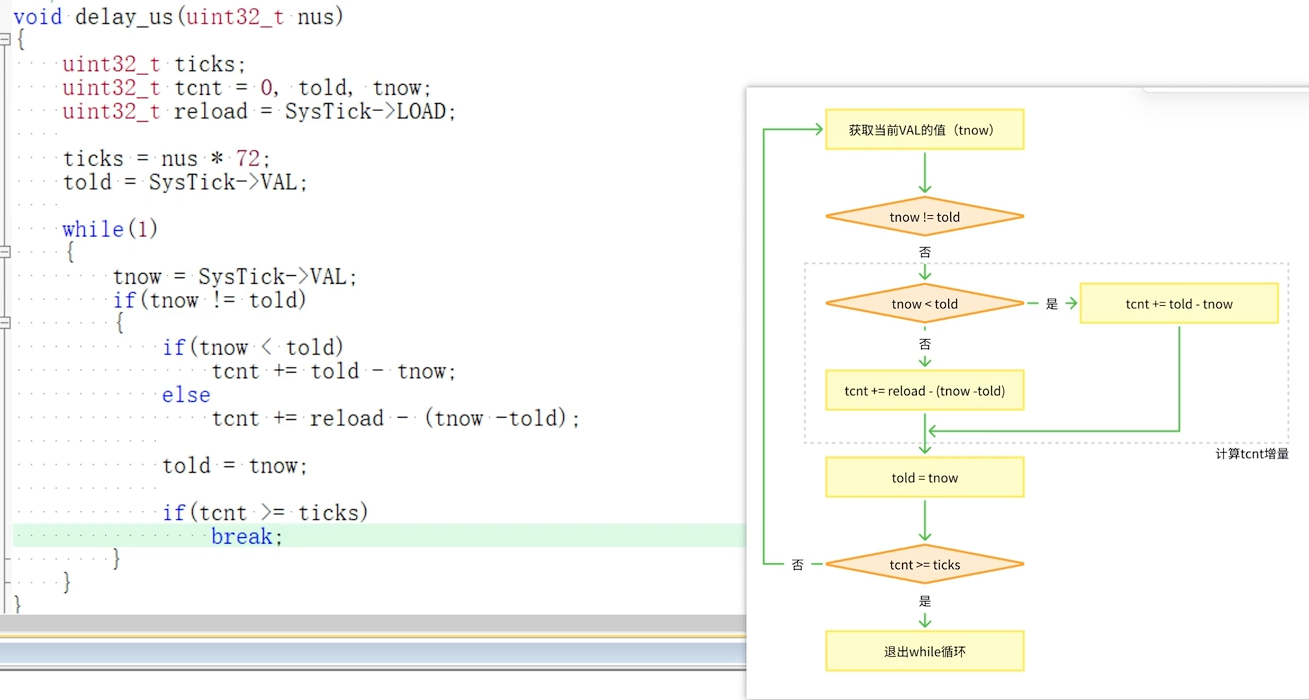 - 核心逻辑:根据 "72MHz 时钟 = 1 微秒计数 72 次",计算出对应延时微秒数需要的计数值,写入重装载寄存器,启动定时器后等待计数到 0;