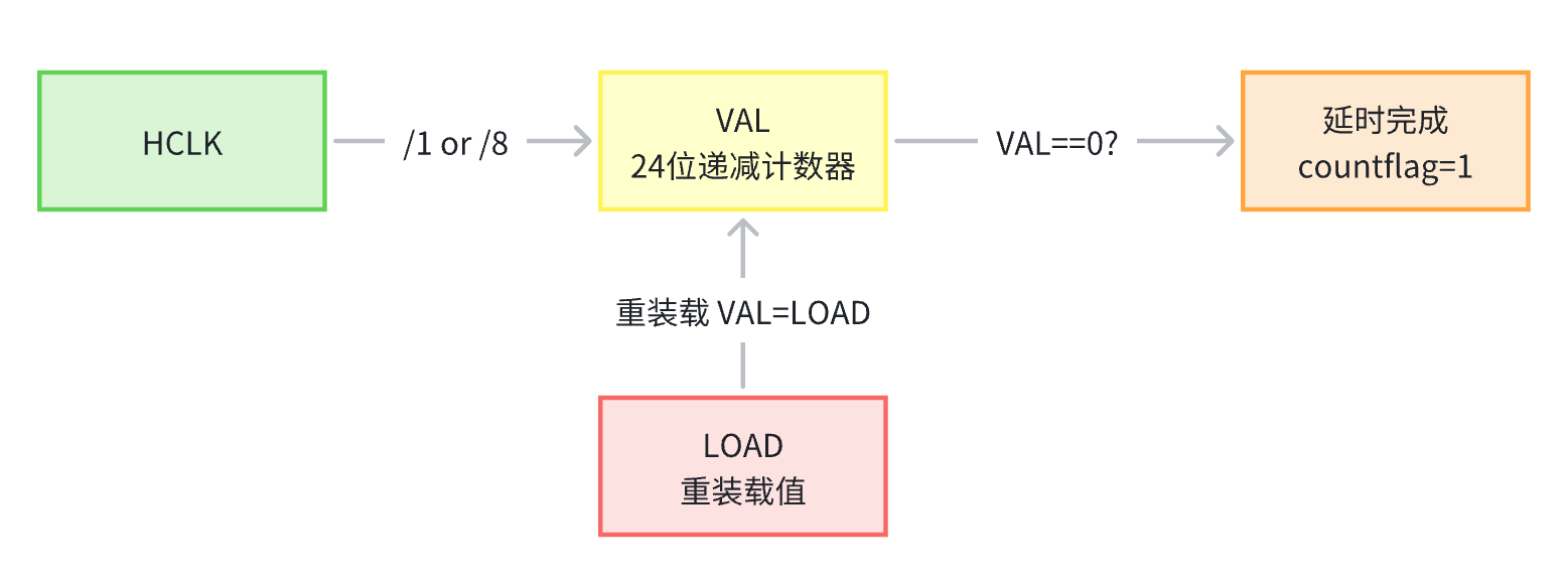- 关键寄存器操作:LOAD(重装载值)、VAL(清空计数)、CTRL(时钟源 + 使能 + 计数完成标志)是实现延时的核心。