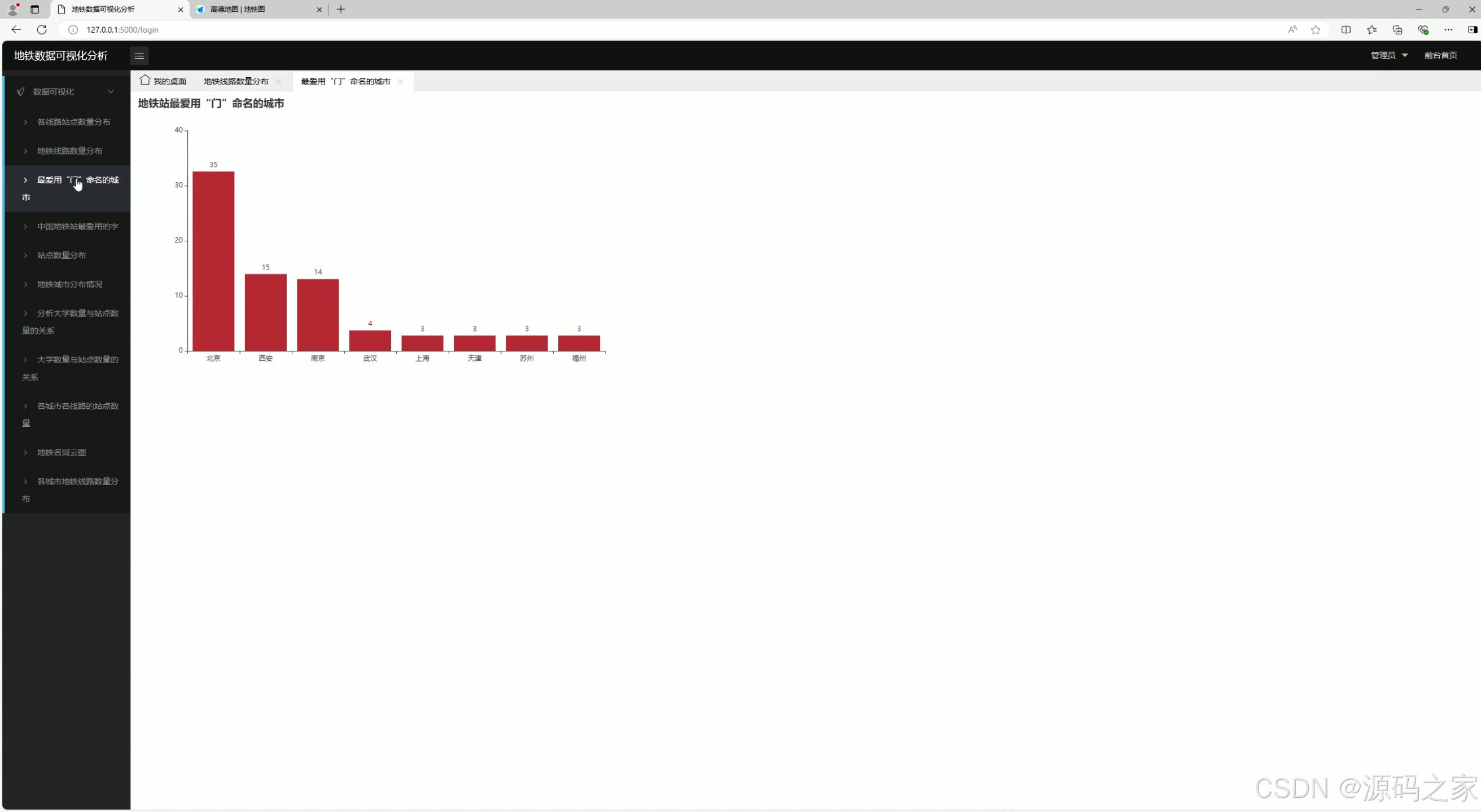 - 功能:分析并展示哪些城市最喜欢用"门"字命名地铁站点。