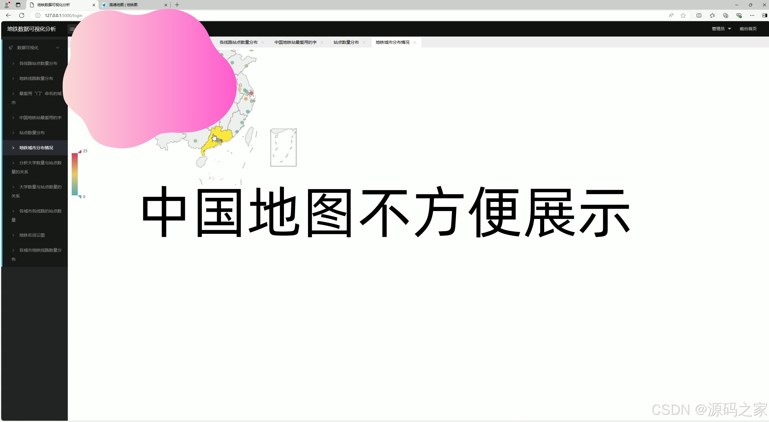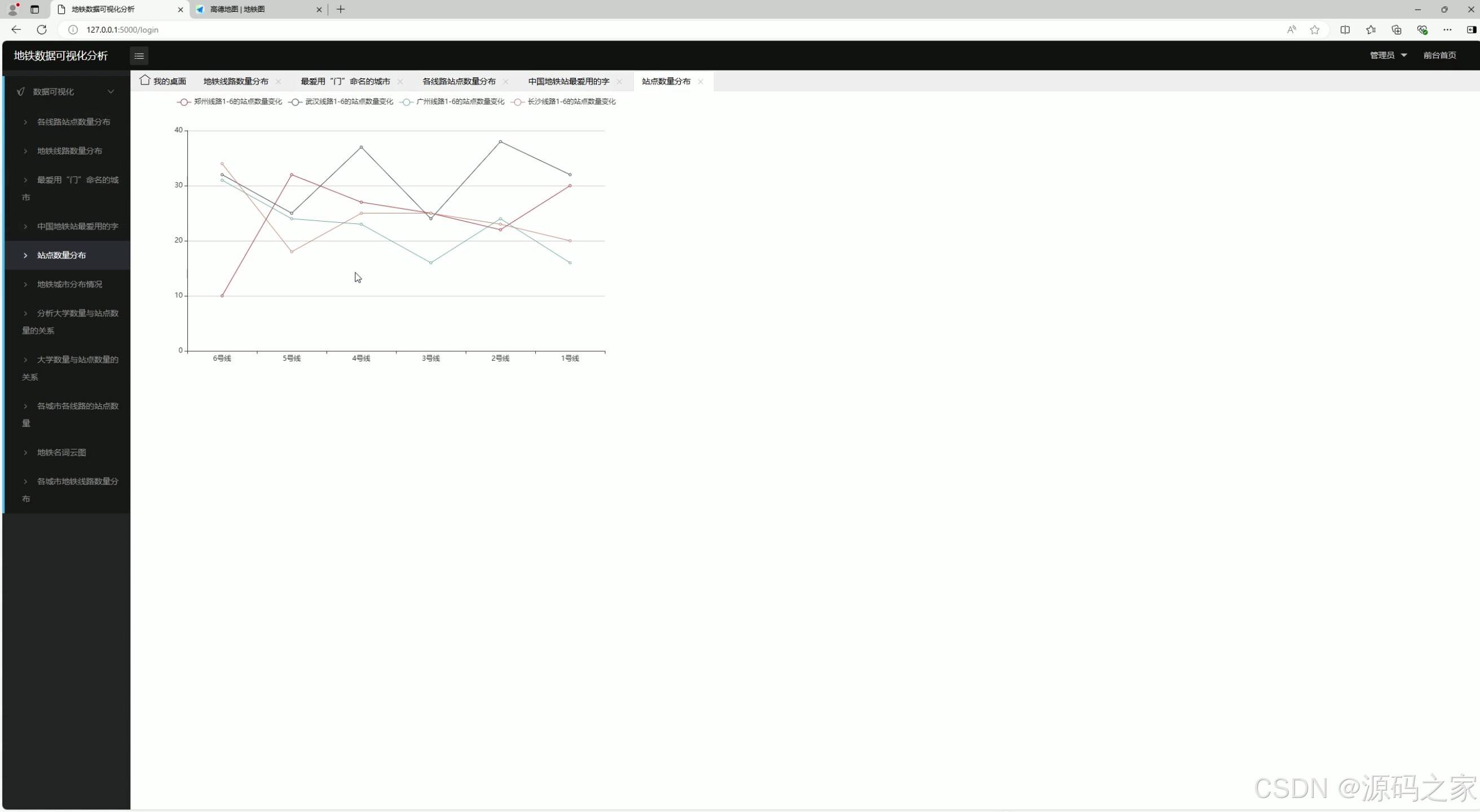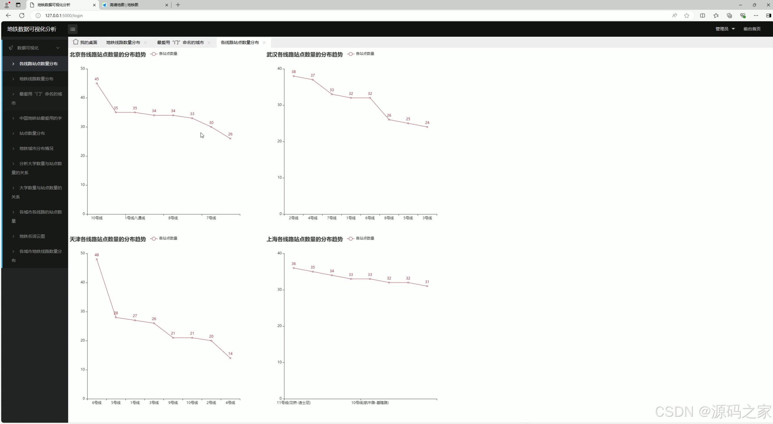 - 可视化展示层:整合Echarts可视化库与高德地图API,以柱状图、词云图、地图标记、散点图等形式,直观呈现地铁线路/站点数量分布、站点命名特征、城市分布等10类核心分析结果;同时设计登录界面,保障系统访问权限。