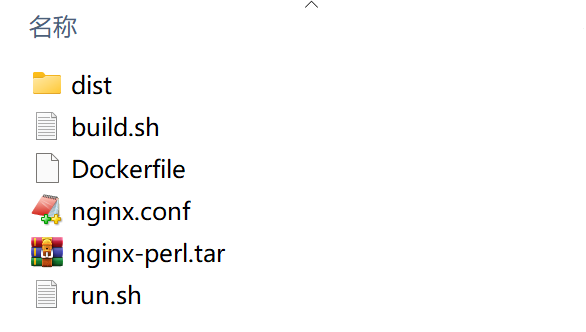 构建前端工程镜像目录结构web,其中dist存放前端工程编译后的文件,build.sh为构建docker镜像包的脚本,Dockerfile为镜像构建基础文件,nginx.conf为nginx配置,nginx-perl.tar为前端构建依赖的基础镜像,run.sh为镜像包部署文件。web包目录结构如下: