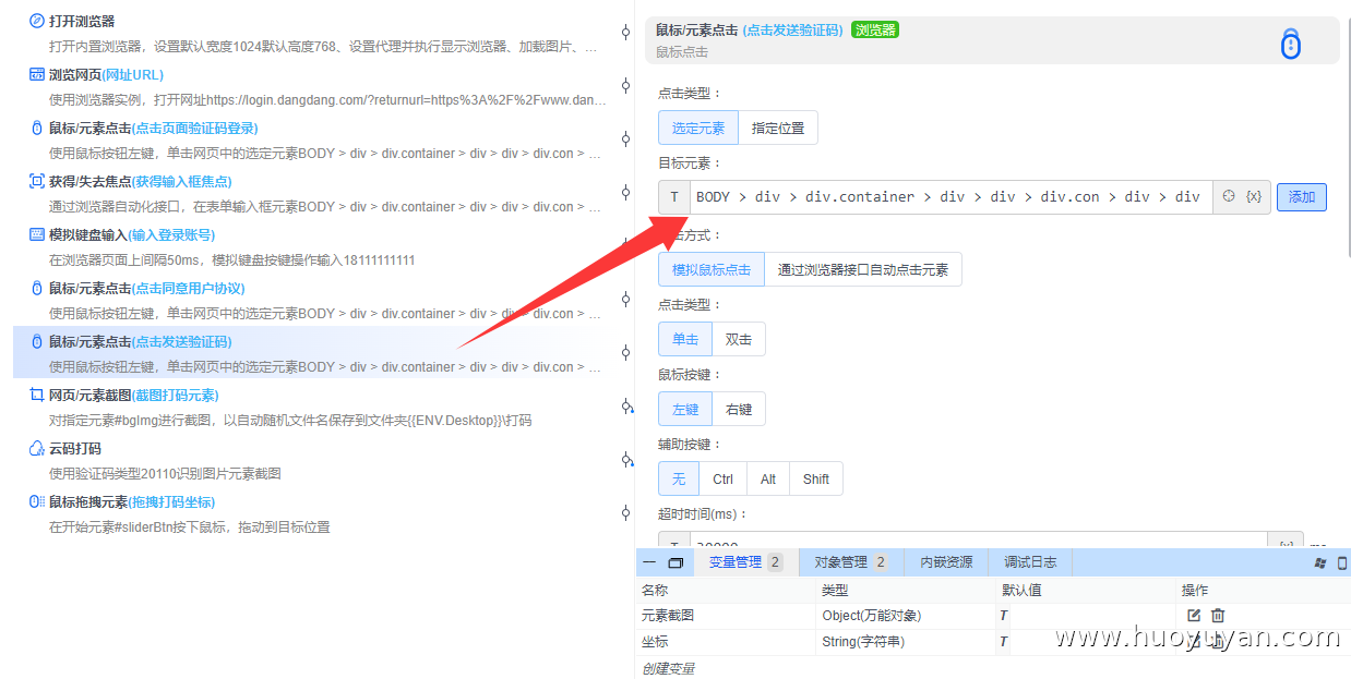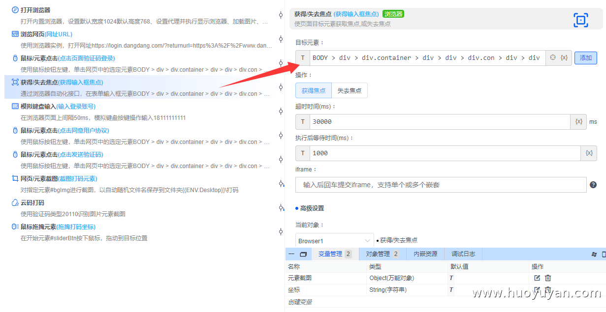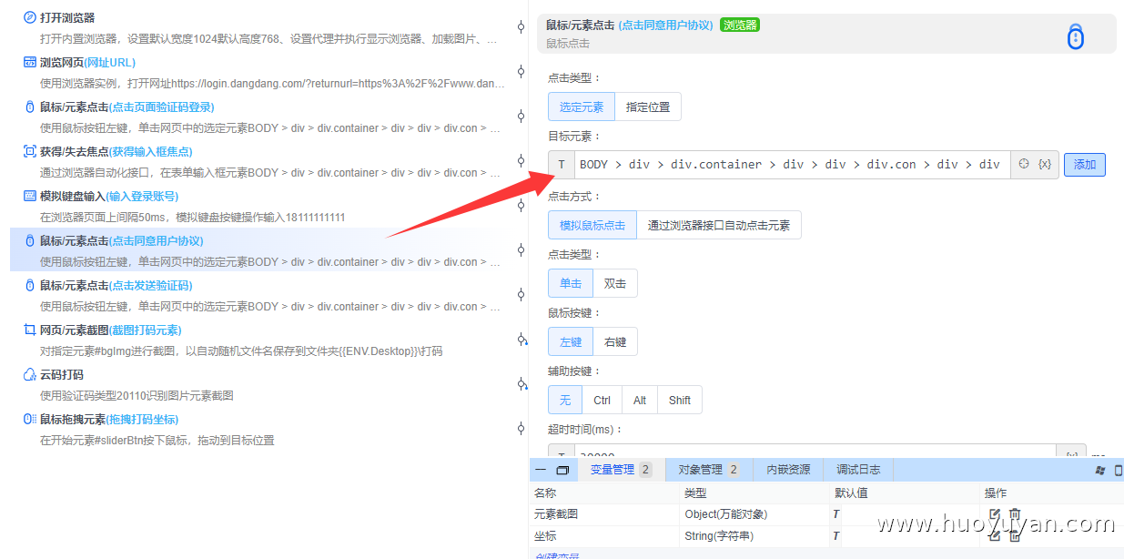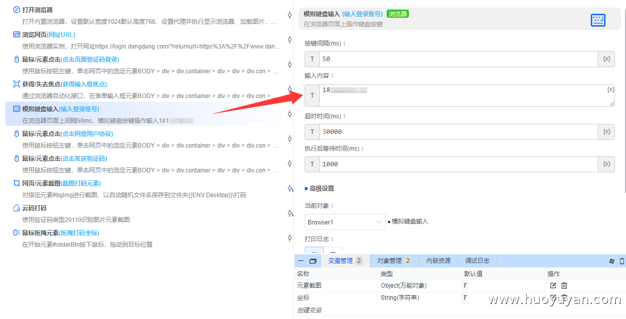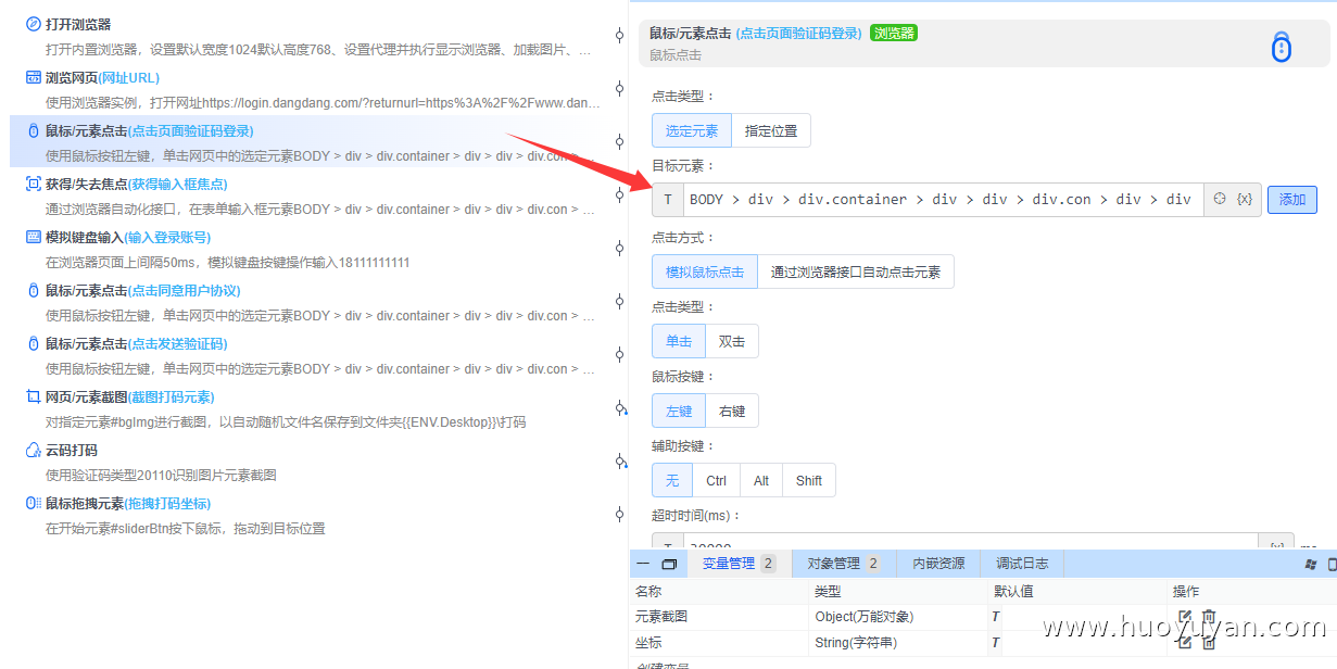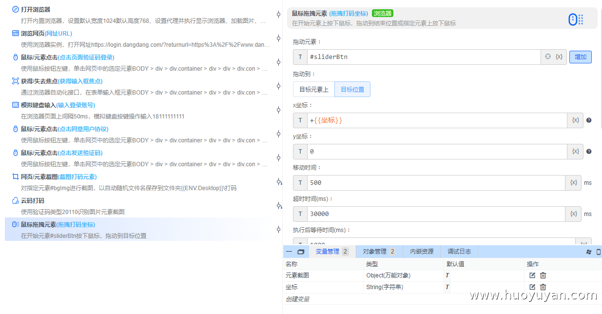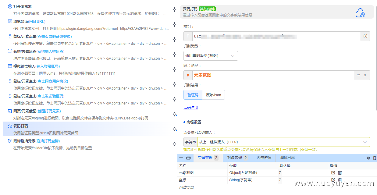 本案例基于火语言RPA实现滑块验证码的自动登录,通过脚本替代人工操作,完成**"打开浏览器→ 访问当当登录页→ 输入账号→ 触发滑块验证码→ 云码打码识别→ 模拟滑块拖动→ 提交登录"** 的全流程自动化。