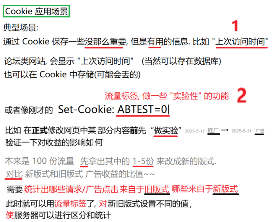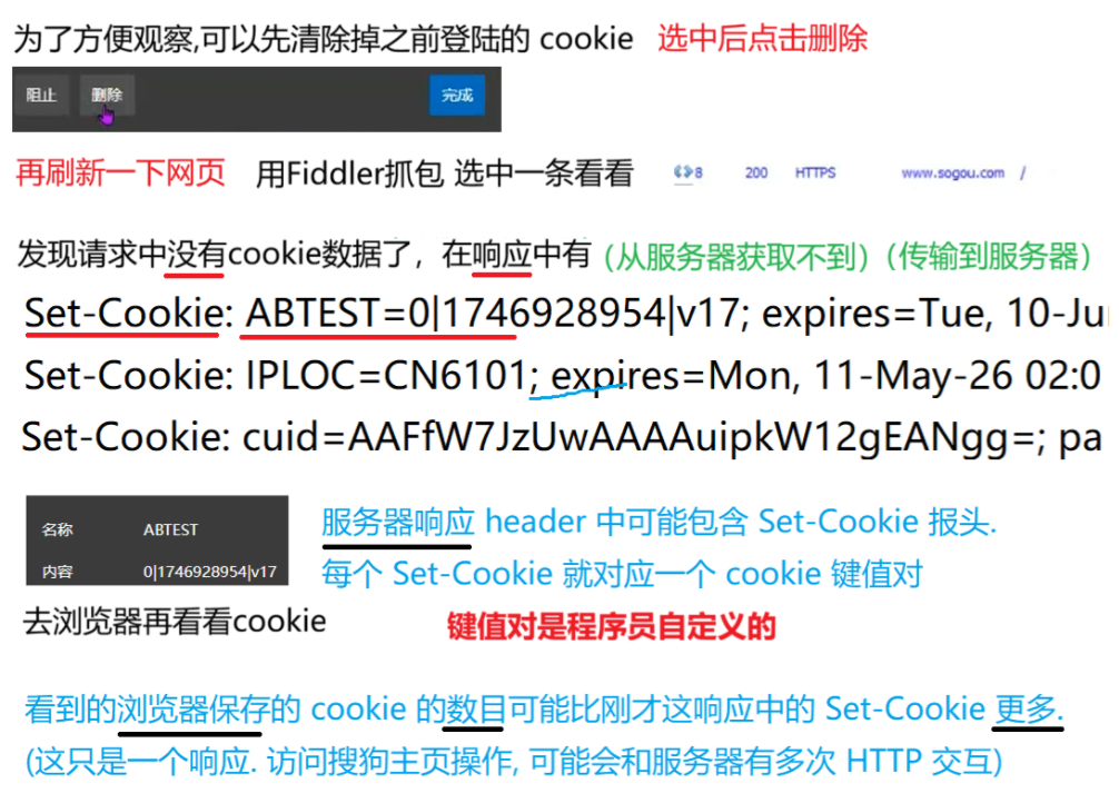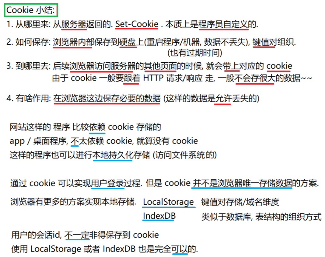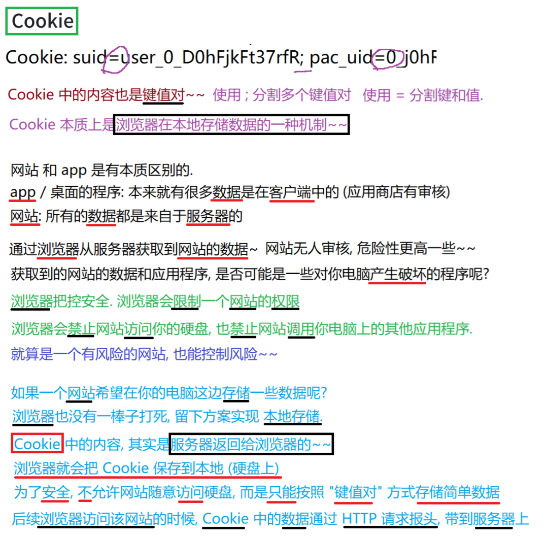 Cookie 中存储了一个字符串, 这个数据可能是客户端 / 浏览器(网页)自行 通过JS写入的,也可能来自于服务器 (服务器在 HTTP 响应的 header 中通过 Set-Cookie 字段给浏览器返回数据), 往往可以通过这个字段 实现 "身份标识" 的功能.