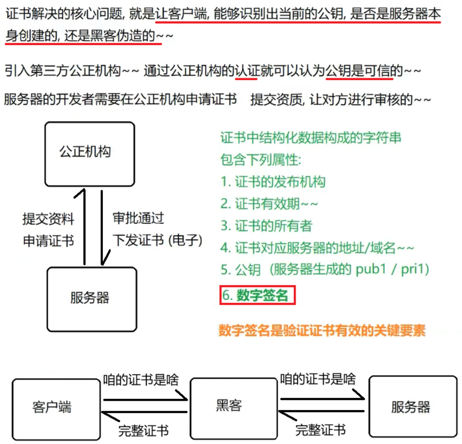 服务器 把证书 传输给浏览器 ,浏览器从证书里获取公钥 就行了,证书就如身份证,证明服务端公钥的权威性。