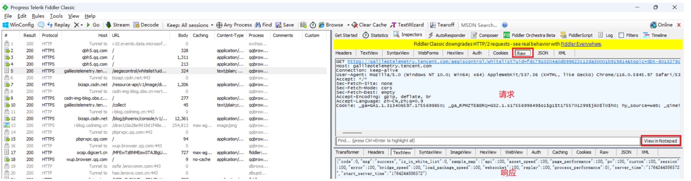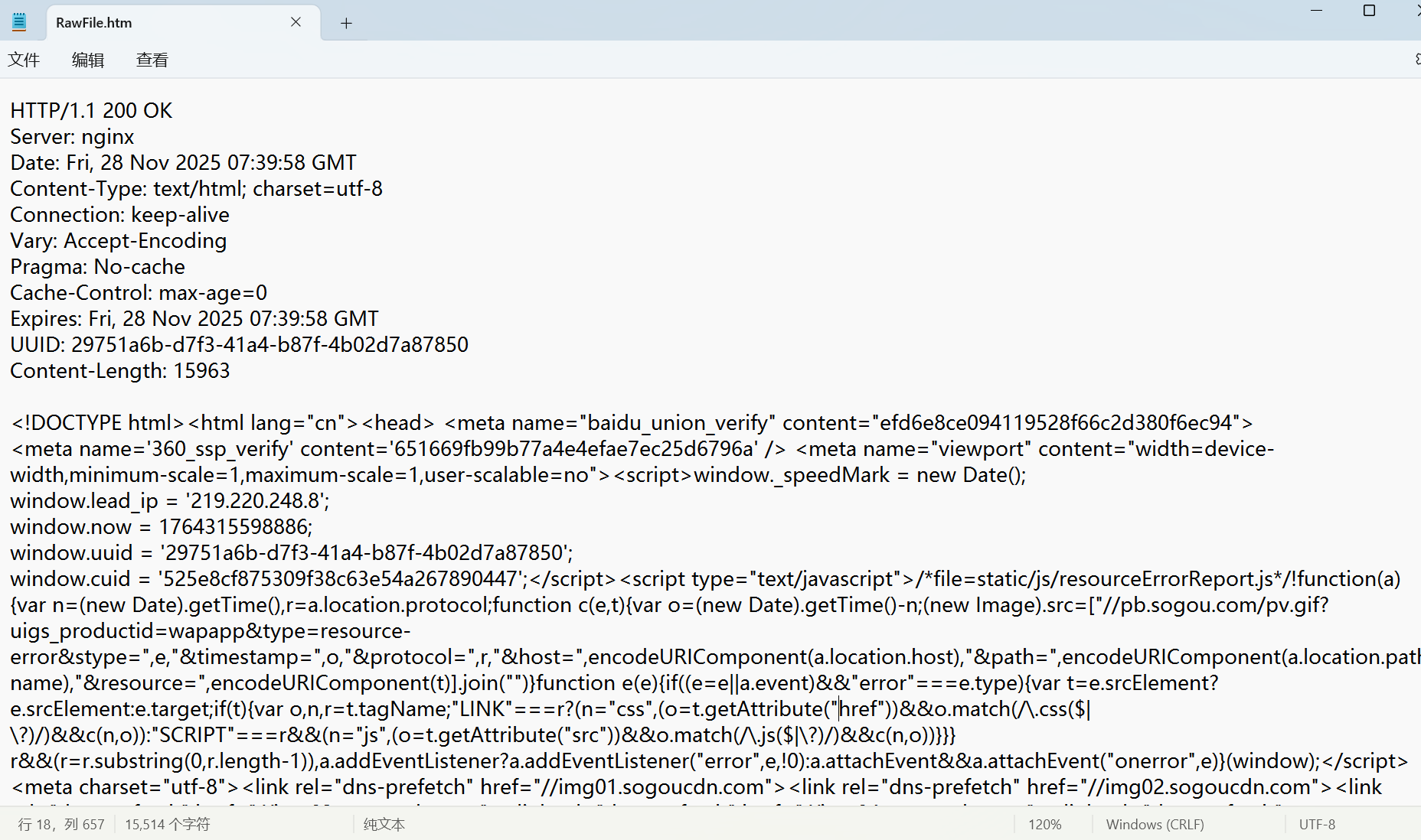 双击 左边蓝色部分www.sogou.com ,观察右侧上方 HTTP请求报文 ,切换到Raw 页,点击View in Notepad 通过记事本打开。