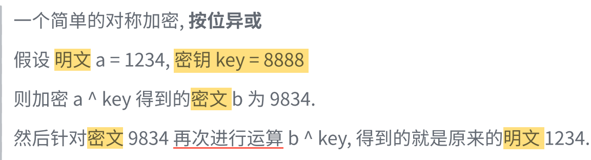 对称加密其实就是通过同一个"密钥",把明文加密成密文 ,并且也能把密文解密成明文。