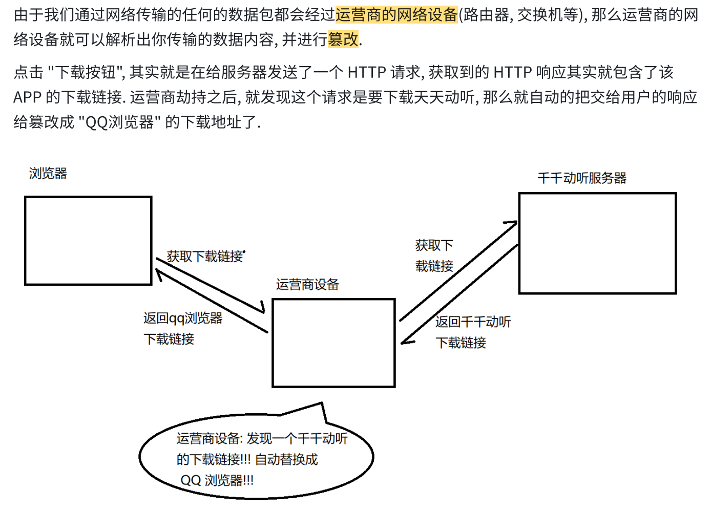不止运营商 可以劫持,其他的黑客 也可以用类似的手段进行劫持 ,来窃取 用户隐私信息,或者篡改内容。