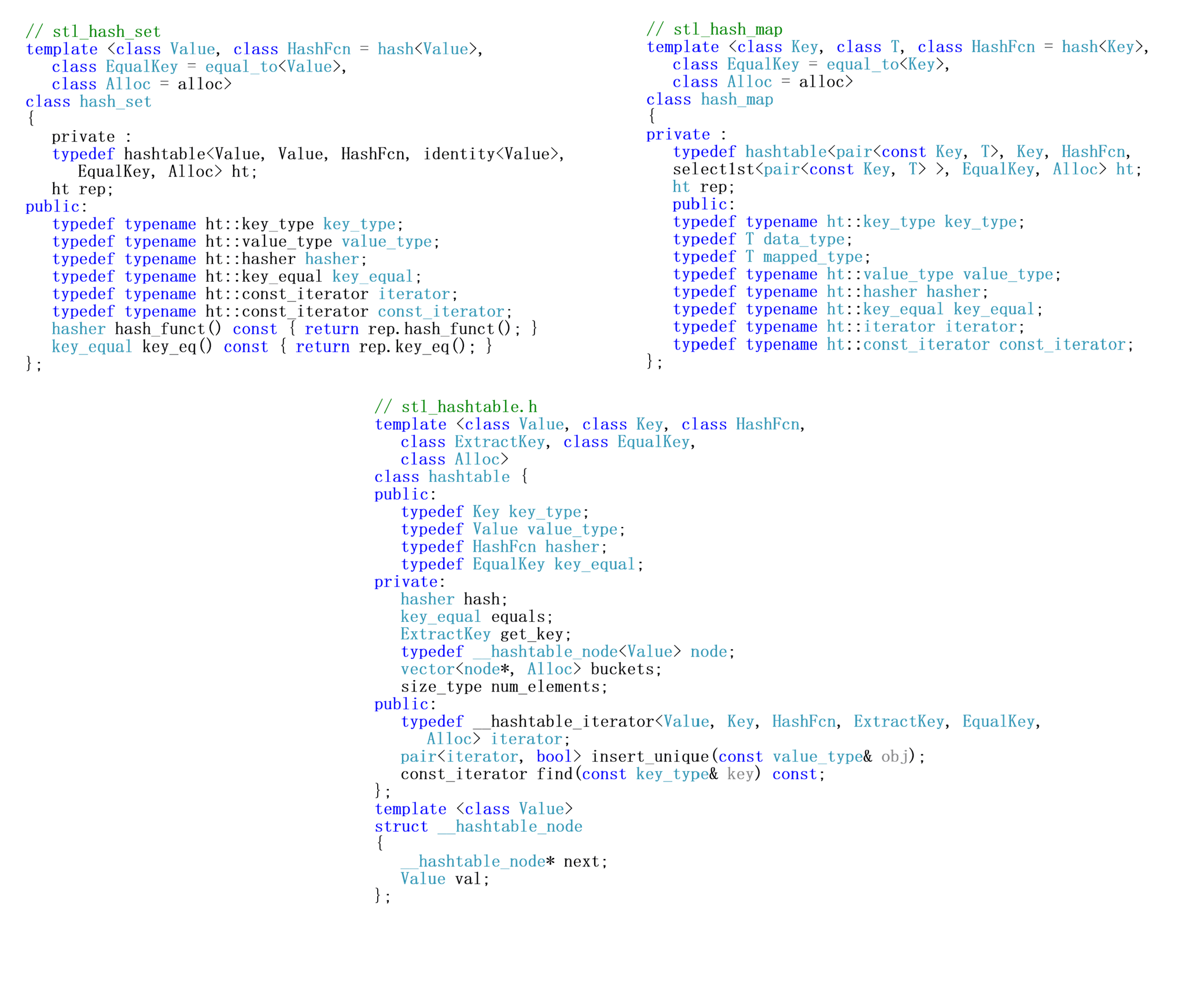 通过源码可以看到,结构上hash_map和hash_set跟map和set的完全类似,复⽤同⼀个hashtable实现key和key/value结构,hash_set传给hash_table的是两个key,hash_map传给hash_table的是pair<const key, value>。
