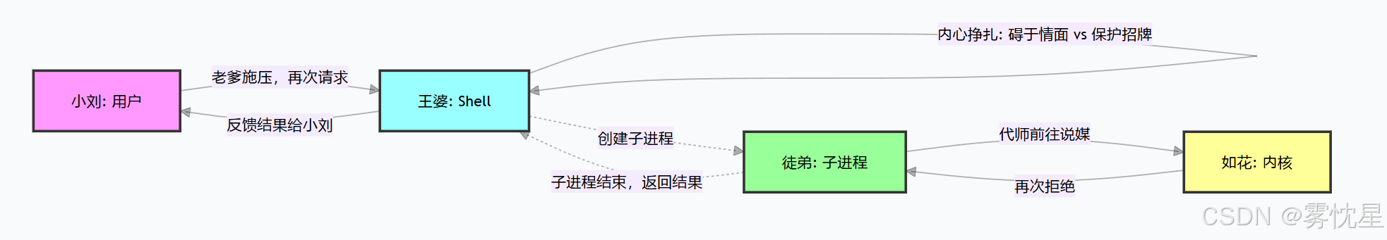 Shell(王婆) 碍于情面无法拒绝,但为了保护自身(不砸招牌),不直接对接内核(如花),而是创建子进程(派徒弟)代为执行请求;- 子进程 (徒弟) 作为 Shell 的代理,向内核(如花)传递请求,内核处理后返回结果(拒绝);