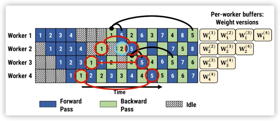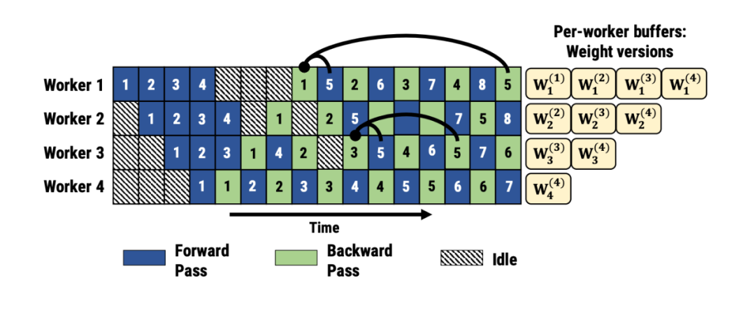 技术解释:Weight stashing为权重维护多个版本,每个active microbatch都有一个版本。每个stage都用最新版本的权重进行前向计算,处理输入的microbatch。计算前向传播之后,会将这份参数保存下来用于同一个microbatch的后向计算。