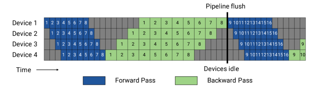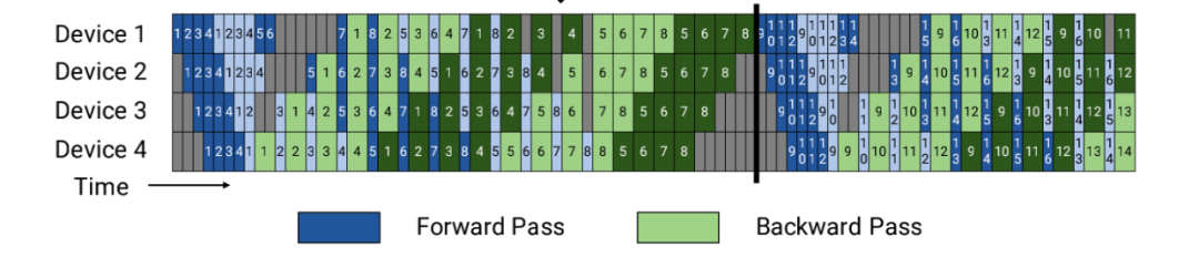 问题: 当设备Device 0计算完成之后,就一直空闲,直到反向传递的最后一步才又开始运行,其他时间都在空跑。同理每个设备都存在严重的资源浪费。