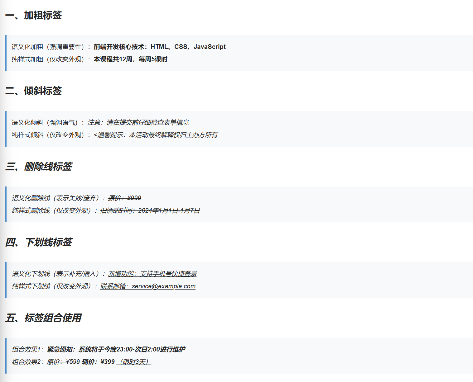 <b>、<<i>、<s>、<u>):仅改变文本外观,不传递任何语义,相当于 "单纯的样式装饰"。推荐用法 :优先使用带语义的标签(