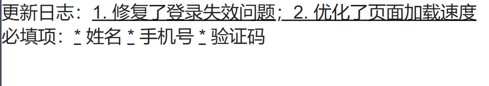 <p>语义化下划线(表示补充/插入):<ins>新增功能:支持手机号快捷登录</ins></p>