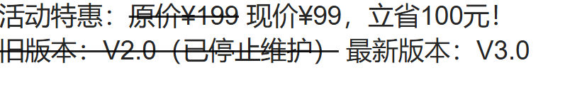<p>语义化删除线(表示失效/废弃):<del>原价:¥999</del></p>