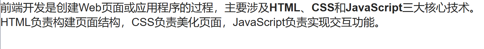 <p>语义化加粗(强调重要性):<strong>前端开发核心技术:HTML、CSS、JavaScript</strong></p>