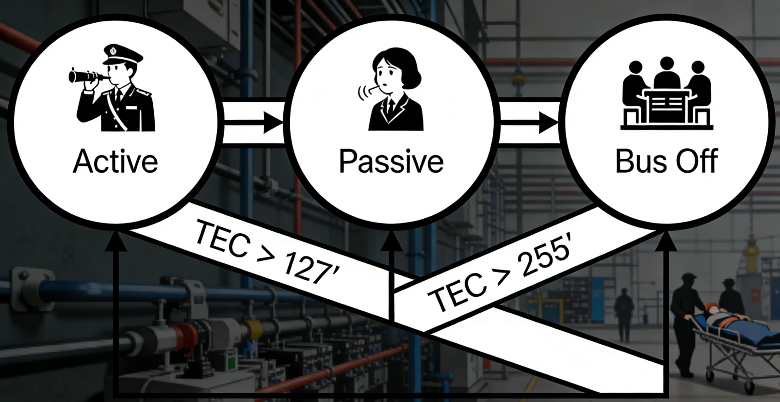 | 主动错误 (Error Active) | TEC < 127 且 REC < 127 | 发现错误后发送 显性错误标志(6位连续0)。 | 全局干扰: 会强制打断全总线的传输,让大家都重发。这是正常的"纠错"状态。 |