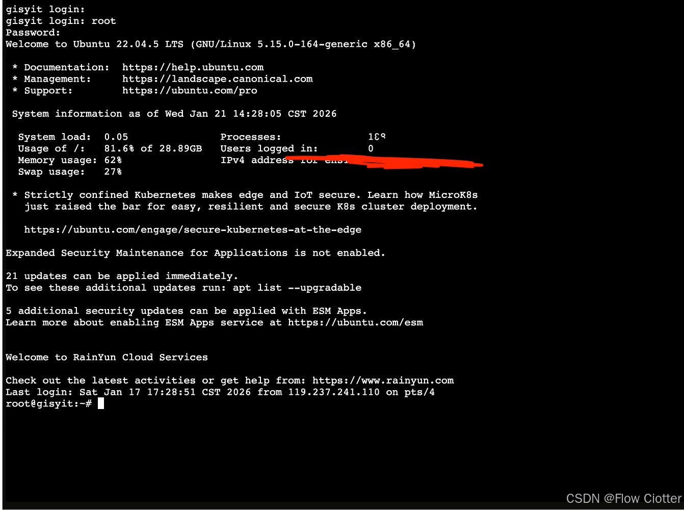 root - 密码:雨云控制台中提供的初始 root 密码