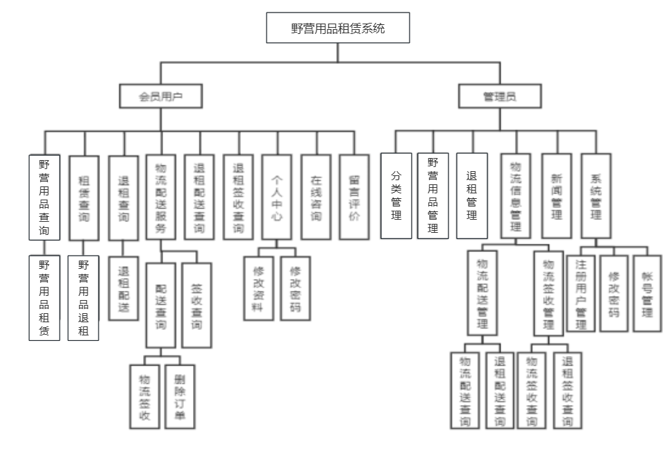(1)游客以及会员都可以查看野营用品信息并通过关键字搜索野营用品相关信息、浏览站内新闻信息、关于野营用品的租赁问题可以进行在线沟通。