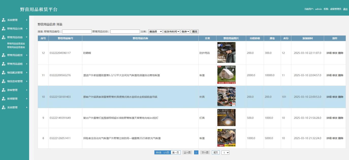 (2)通过野营用品租赁管理查看用户租赁的野营用品相关信息,进行物流配送以及删除、修改相关操作。