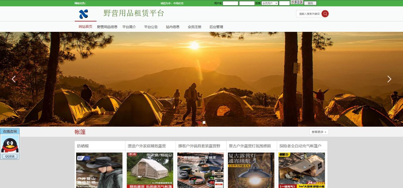 随着互联网技术的发展与普及,传统的经营方式受到很大影响。野营用品租赁系统是以互联网为基础的线上租赁方式。传统野营用品店的纸质化服务流程繁琐,浪费人力物力。线上租赁可以实现网页挑选野营用品并完成一系列预订、交定金等服务,实现野营用品的信息化管理。通过野营用品租赁系统的设计,实现工作流程的高效性,解决传统租赁流程的复杂性。本系统采用Spring+SpringMvc+Mybatis框架,使用web服务器Tomcat以及MySQL数据库来实现。主要包含游客、会员、管理员三种角色,实现了前台基础信息展示以及会员与管理员的后台管理界面。主要功能模块包括:野营用品信息展示、申请租用、租用信息管理、账单信息、留言评价、物流管理等模块,为用户提供方便快捷的优质服务。野营用品租赁系统实现的功能描述如下: