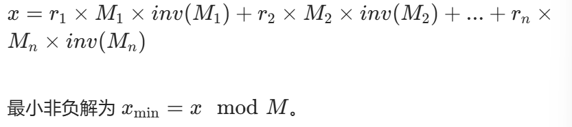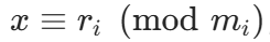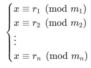 其中 m1,m2,...,mn 是模数,r1,r2,...,rn 是余数,我们的目标是找到满足所有方程的最小非负整数解 x。