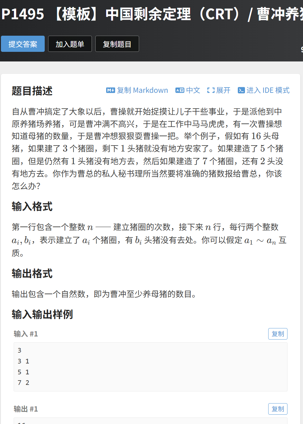 五、实战例题 1:洛谷 P1495 【模板】中国剩余定理 / 曹冲养猪