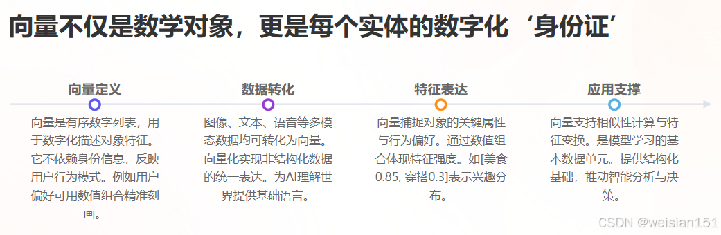 但在AI语境下,我们可以更直观地理解为:一个对象的数字化身份证------由一组有序数字组成,每个数字代表一个属性。