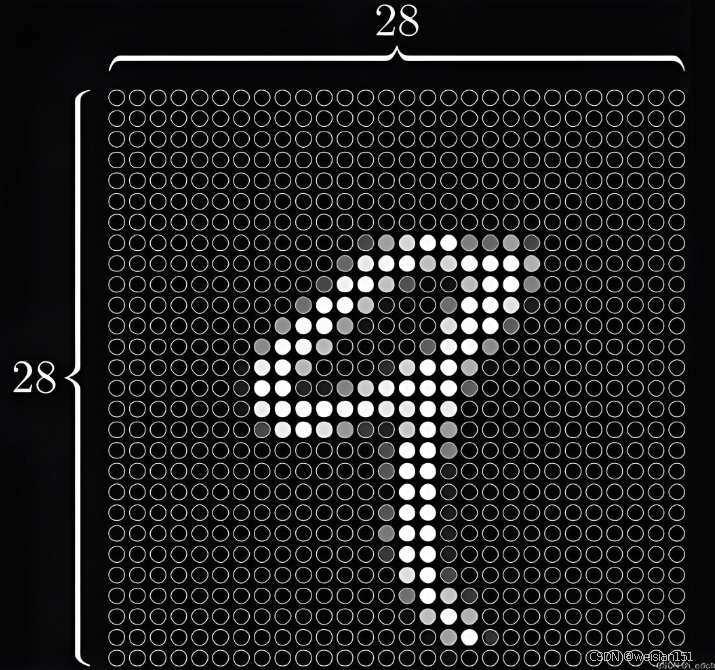 一张 28×28 的手写数字图,共 784 个像素。AI将其展平为一个 784 维向量:
