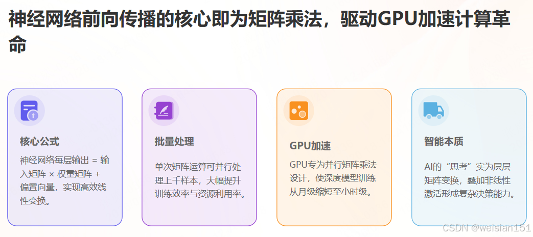 - 模型运算:神经网络的前向传播、反向传播,本质都是线性代数运算。