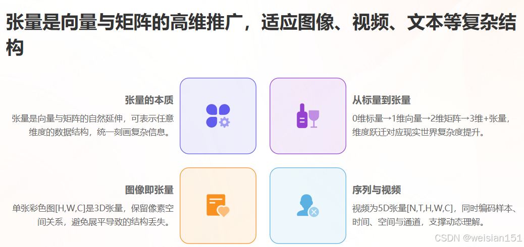 - 高维数据(图、视频、文本)→ 高维张量(3D+)