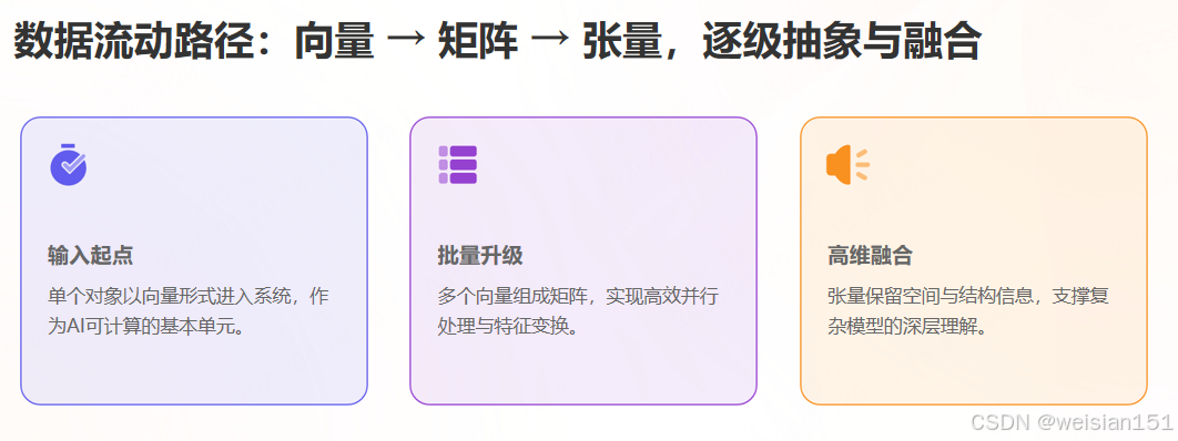 向量、矩阵、张量并非孤立存在,而是层层递进、协同工作,构成AI数据处理的完整链路: