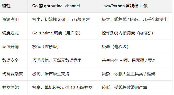 很多人会问:Java 也有线程、Python 也有协程,Go 的并发到底好在哪?这里做一个清晰的对比,也是 Go 的核心竞争力: