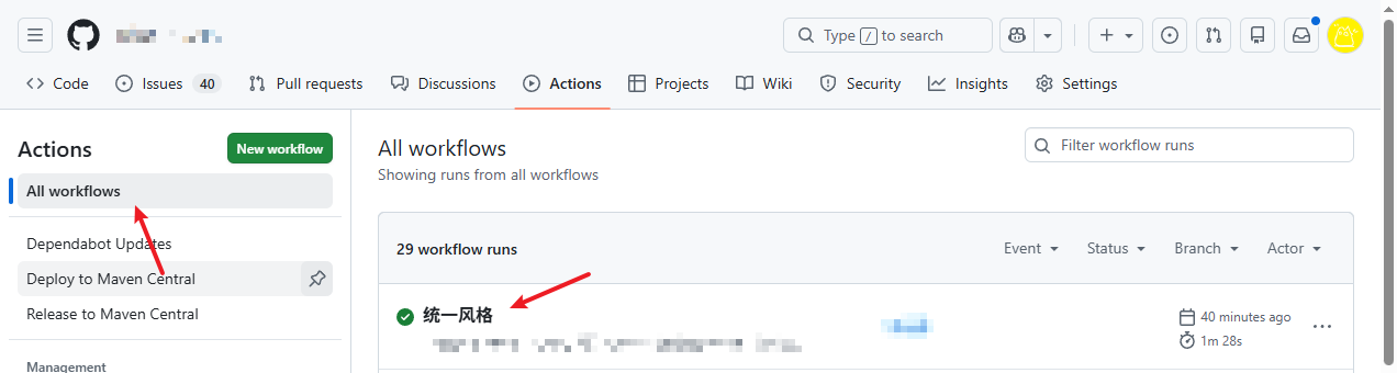 回到Github项目首页,点击 Action 找到我们的步骤名称 Deploy to Maven Central ,展开 Run workflow 点击 Run workflow