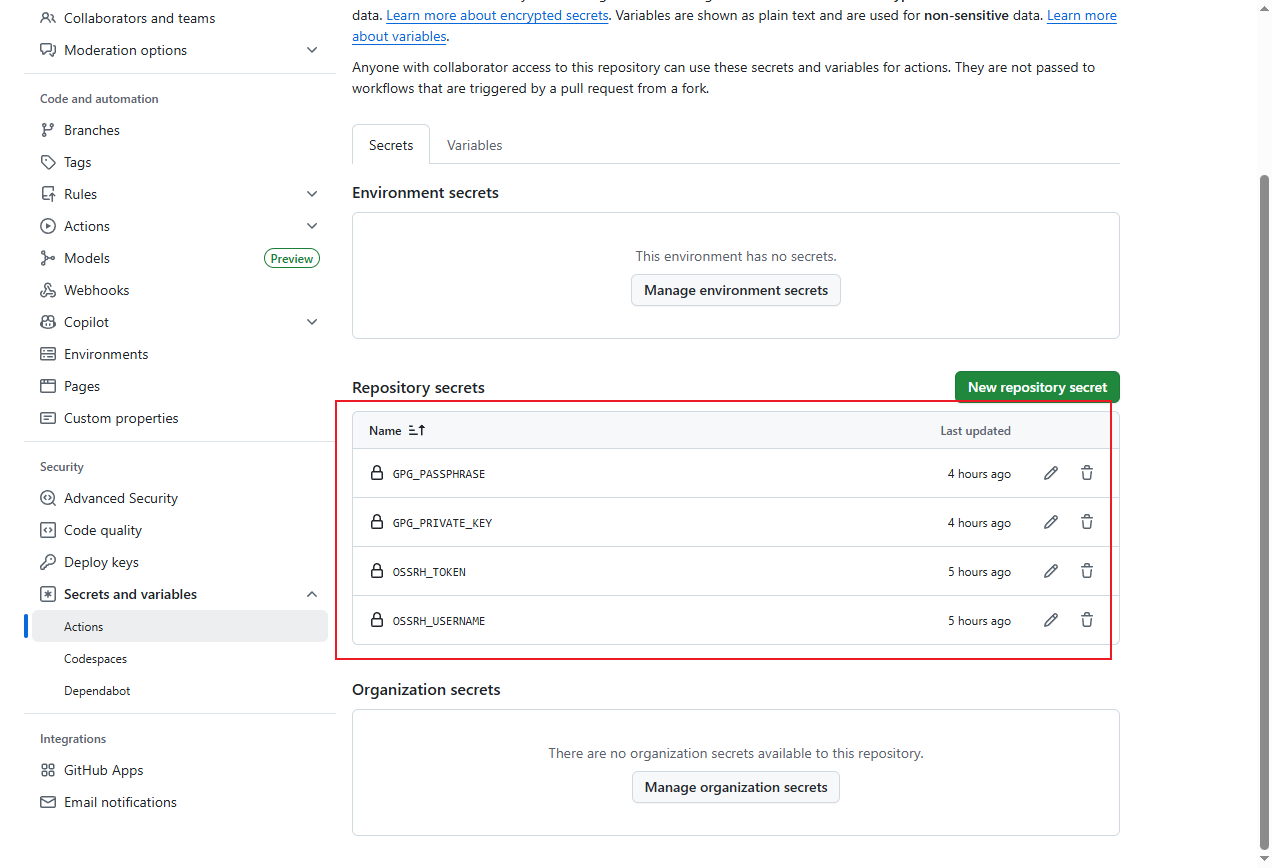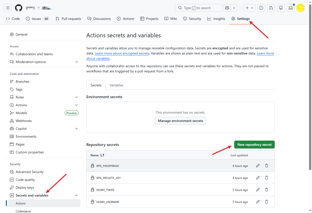 进入Github仓库 Setting > Secrets and variables > New repository secret