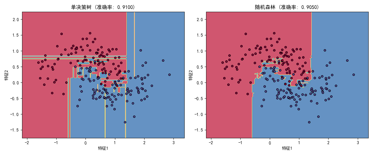 make_moons:生成非线性可分的月牙形数据,模拟真实场景中的复杂数据DecisionTreeClassifier:单决策树模型(对比基准)RandomForestClassifier:随机森林模型,n_estimators指定树的数量- 决策边界可视化:直观展示随机森林比单决策树的边界更平滑,过拟合更少