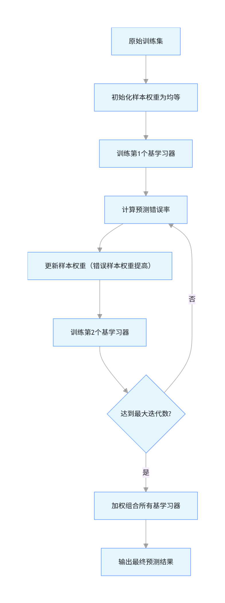 Boosting 的核心思想是 "知错就改":先训练一个基学习器,然后关注它预测错误的样本,调整样本权重,再训练下一个基学习器,直到达到指定的基学习器数量。