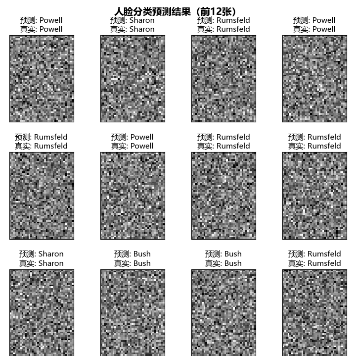 fetch_lfw_people:加载 LFW 人脸数据集,包含多位知名人物的人脸照片- PCA 降维:将高维的人脸像素特征降维到 150 维,减少计算量,提升模型性能