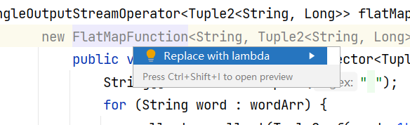 我们在写FlatMap里面的匿名内部类的时候,显示new FlatMapFunction<String, Tuple2<String, Long>>() 是灰色的,因为IDEA推荐我们使用Lambda表达式
