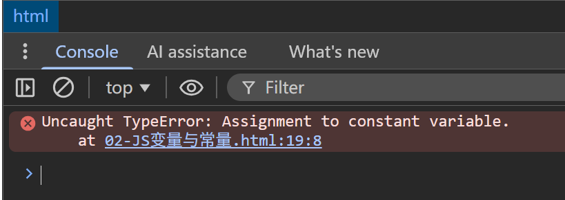 输出到控制台,是输出到浏览器的控制台,我们可以进入浏览器后右键空白处,选择Inspect(检查)即可看到控制台。如果我们修改了常量,VSCode并不会报错,报错信息会显示在浏览器的控制台。
