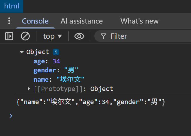 let personJSON = '{"name":"埃尔文","age":34,"gender":"男"}';