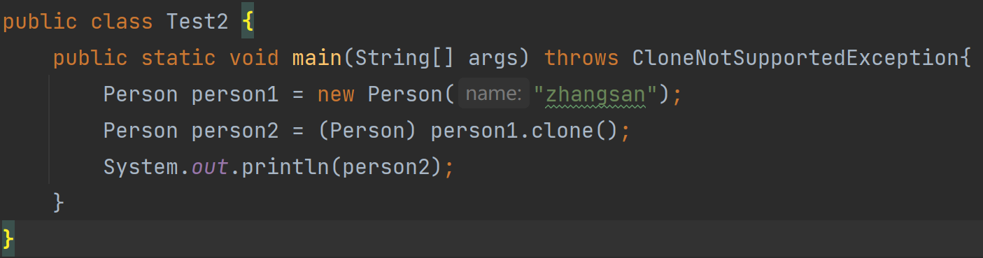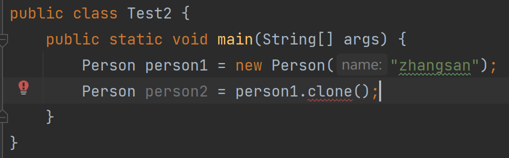 当我们想要实现克隆时,必须要有克隆接口Cloneable,我们定义一个类person实现克隆接口,创建person1对象,并且在创建一个person2对象负责接收person1的克隆,当我们调用clone方法时,发现调用不了