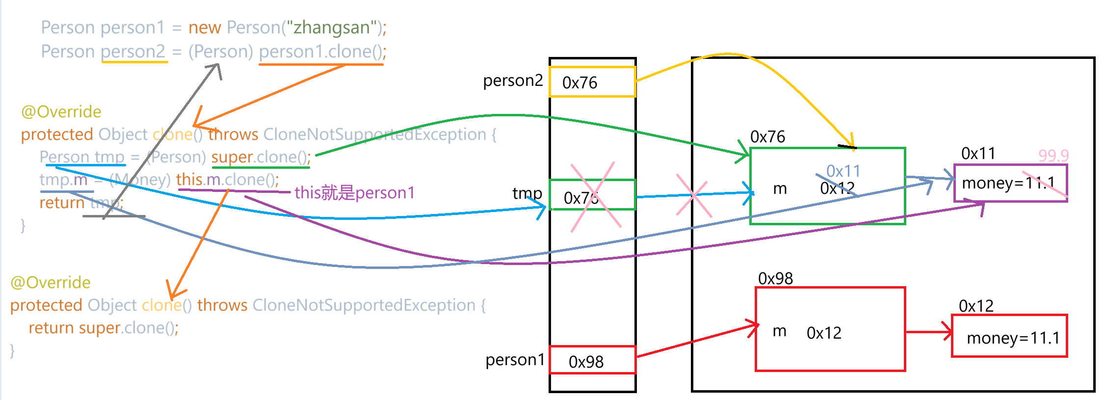 通过修改person2.m.money,打印person1.m.money和person2.m.money结果都为11.1,99.9