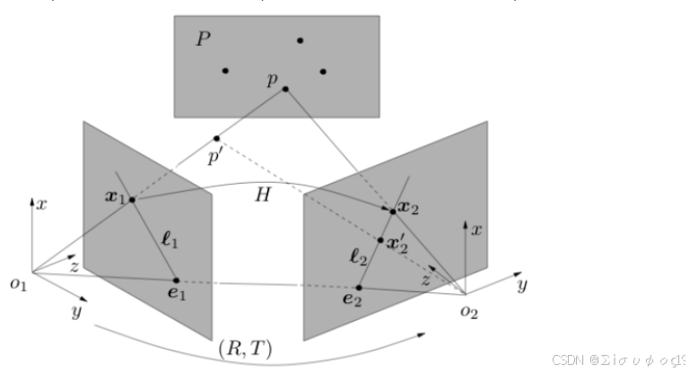 H是从图像1到图像2的单应,那么H⁻¹就是从图像2到图像1的单应。 -