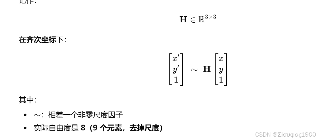 H本身也具有尺度不变性 。即,H和kH(k为非零标量)表示的是同一个几何变换。因此,H只有 8 个自由度 (通常通过令h₃₃ = 1或其他约束来固定尺度)。