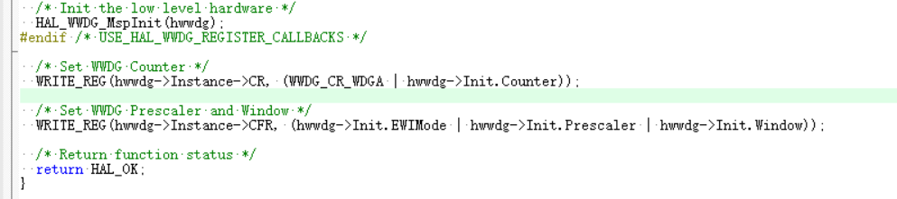 • 阅读源码,HAL_WWDG_Init()的源码,下面是初始化函数最核心部分,这里调用了Msp函数,并且相应寄存器赋值,如图: