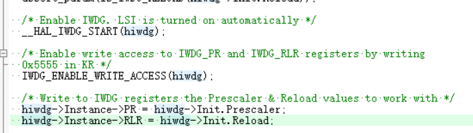 • 阅读HAL_IWDG_Init()的源码,主要是核心是这4步,启动IWDG,写使能,赋值PR和RLR寄存器,下面还有一次"喂狗操作"(没截取出来),如图: