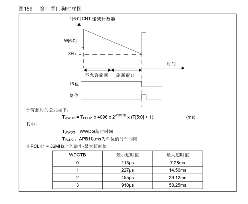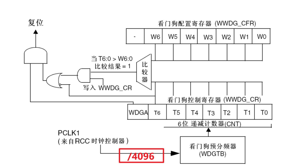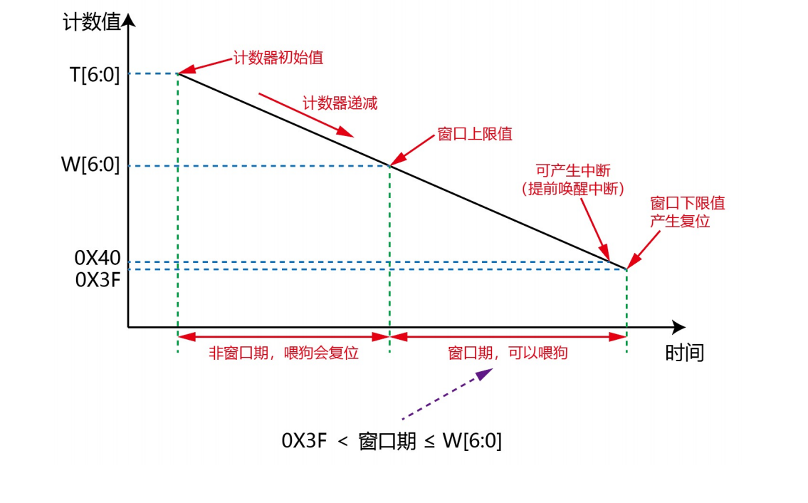 • 计数器的值大于**W[6:0]**时喂狗会复位。(这里W[6:0]表示的时窗口值)。